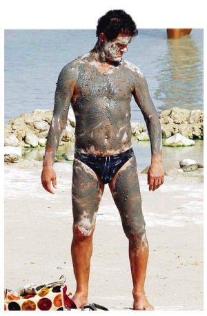 意大利南部小城大多有水溫從32到37攝氏度不等的溫泉,這些景點(diǎn)專門(mén)提供一些泥浴治療服務(wù)。來(lái)這里享受休閑的卡佩羅及其妻子就這樣一不小心落入了記者的鏡頭。與比賽場(chǎng)邊的威嚴(yán)姿態(tài)大相徑庭,鏡頭前只穿了一條黑色泳褲的卡佩羅從頭到腳、甚至包括臉部都涂滿了深灰色的泥漿,要不是那一頭標(biāo)志性的卷發(fā),意大利人的身份還真有些難以“識(shí)別”。身邊的勞拉更將泥漿涂抹得辨別不出了比基尼的花色。低頭看看自己身上的“作品”還算令人滿意,63歲的卡佩羅于是走到勞拉身邊,和自己的老婆開(kāi)起了玩笑。