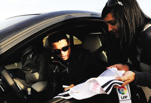 傷勢痊愈即將參賽,也令C羅心情大好。當(dāng)C羅在結(jié)束訓(xùn)練駕車離開時,受到了皇馬球迷的熱烈歡迎。球迷高舉著他的球衣,呼喊C羅的名字,而C羅也以禮相待,盡量滿足球迷的要求,簽名、合影留念,皇馬頭牌十分有親和力,更是在車?yán)锬托牡貫橐晃幻琅蛎院灻,并且滿足了其合影的要求。換了新發(fā)型,挑染了頭發(fā),帶著太陽眼鏡,穿著閃亮的皮衣,似乎來到了馬德里,和這里眾多的造型達(dá)人朝夕相處,C羅的時尚觸覺也更加提升了。