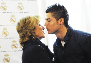 北京時間昨天是C羅的生日,他和皇馬主席弗洛倫蒂諾一起在伯納烏參加了一項新聞發(fā)布會;蜀R俱樂部與馬德里大區(qū)達成了合作協(xié)議,皇馬基金會將會投資幫助馬德里大區(qū)那些未成年人、外國移民等等。在新聞發(fā)布會現(xiàn)場,C羅和弗洛倫蒂諾開起了玩笑。皇馬主席問C羅“你現(xiàn)在多大了”,C羅回答“我20歲了”。弗洛倫蒂諾當即揭穿了C羅的謊言:“你已經(jīng)25歲了,你竟然已經(jīng)這么老了!”當然,這次玩笑以全場歡笑告終!∽鳛榛蜀R代表,C羅還與馬德里大區(qū)女主席阿吉雷進行了親密接觸。盡管阿吉雷的年齡足以當C羅的奶奶,但葡萄牙人還是跟她來了一個貼面熱吻。在被C羅熱吻之后,阿吉雷顯得非常高興,立刻說:“C羅是世界上最出色的球員,沒有之一。”同時阿吉雷也宣稱,“皇馬是歷史上最出色的足球俱樂部!