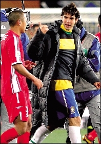 賽前大屏幕用視頻方式公布各隊首發(fā)名單,卡卡出現(xiàn)時,引發(fā)了全場最響亮掌聲和尖叫聲。當(dāng)卡卡踏上球場,球迷的呼喊聲也是最大的。但比賽中的卡卡讓球迷失望了?ǹ看文们蛏磉吙倳3名球員包夾。帶球被搶斷、傳球不到位、多次被撞翻,甚至帶球急停時摔跤。很顯然,卡卡的身體狀態(tài)非常糟糕。第80分鐘,卡卡被換下。賽后,心煩的卡卡甚至拒絕了鄭大世交換球衣的要求。