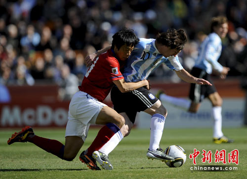 中新網(wǎng)6月17日電 北京時(shí)間今晚19點(diǎn)30分,2010年南非世界杯B組第二輪的首場(chǎng)比賽打響,由兩屆世界杯冠軍得主阿根廷隊(duì)迎戰(zhàn)亞洲“太極虎”韓國(guó)隊(duì)。16分鐘韓國(guó)隊(duì)前鋒樸周永不慎打入本屆世界杯的第二記烏龍;33分鐘阿根廷再獲得定位球,伊瓜因門(mén)前頭槌建功,2-0;上半場(chǎng)補(bǔ)時(shí)階段韓國(guó)隊(duì)由李青龍扳回1球,但下半場(chǎng)伊瓜因連入2球,上演本屆世界杯的第一個(gè)帽子戲法,助阿根廷4-1鎖定勝局,提前小組出線。