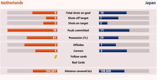 荷蘭隊全場比賽有9腳射門,5次射中門框范圍內(nèi),其中包括一個進(jìn)球和兩次被日本隊門將川島永嗣化解的必進(jìn)球機會。日本隊有10腳射門,3腳射中門框范圍,其中最后階段的一次射門險些將比分追平。日本隊的角球同樣多于荷蘭隊,5次角球,比荷蘭隊多了一個。
