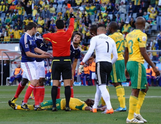 也許失球只是法國隊噩夢的開始,比賽進行到第25分鐘,法國隊攻入南非隊禁區(qū),中場球員、有著“齊達內接班人”之稱的古爾庫夫在爭頂頭球時肘部擊中了對手,南非隊隊員就勢倒地不起做昏厥狀。主裁判果斷出示紅牌,將古爾庫夫罰下。