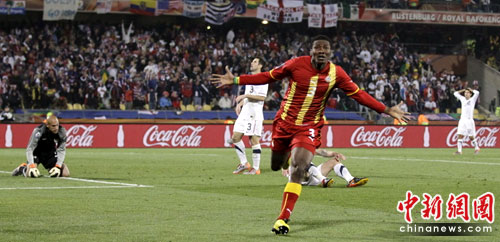 中新網(wǎng)6月27日電 今天凌晨2:30,南非世界杯1/8決賽第二場美國與加納的比賽,在勒斯滕堡的皇家巴?锨驁隼_戰(zhàn)幕。憑借普林斯·博阿滕和多諾萬在上下半場的進球,雙方在90分鐘之內(nèi)戰(zhàn)成1-1平。而加時賽中,中鋒吉安突破射門建功,幫助加納隊昂首晉級八強。