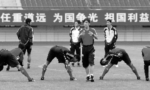 昨日上海驟然降溫,淅淅瀝瀝的小雨悄然而至,國(guó)家隊(duì)下午5時(shí)出現(xiàn)在訓(xùn)練場(chǎng)上,金山體育中心為國(guó)足打出“任重道遠(yuǎn)、為國(guó)爭(zhēng)光、祖國(guó)利益高于一切”的橫幅。主帥高洪波身穿紅衣短袖,而助理教練傅博、區(qū)楚良則身穿白底的運(yùn)動(dòng)外套,在國(guó)家隊(duì)隊(duì)員的包圍中,甚至很難辨別出少帥之身份。國(guó)安隊(duì)及山東隊(duì)的6名隊(duì)員由于航班原因遲到,因此首堂訓(xùn)練課由25名隊(duì)員參與。由于國(guó)足隊(duì)員上周末剛打完職業(yè)聯(lián)賽,因此首堂訓(xùn)練課主要以恢復(fù)性訓(xùn)練為主。訓(xùn)練內(nèi)容從慢跑開(kāi)始,隊(duì)員們并沒(méi)有成群結(jié)隊(duì)一同跑,而是三三兩兩地分開(kāi)慢跑,鄭智、王新欣與周海濱分成一組,慢跑中隊(duì)員不時(shí)聊天談笑,氣氛顯得十分輕松,絲毫不覺(jué)聯(lián)賽過(guò)后的疲憊。隨后在傅博的帶領(lǐng)下,隊(duì)員分成三組進(jìn)行搶圈訓(xùn)練,高洪波則在一旁當(dāng)“監(jiān)工”。在訓(xùn)練尾聲,以高洪波領(lǐng)銜的教練組與國(guó)足一同慢跑,此次慢跑持續(xù)了超過(guò)20分鐘。一個(gè)半小時(shí)的訓(xùn)練結(jié)束后,山東魯能的4名隊(duì)員韓鵬、王永珀、吳昊及劉金東才姍姍來(lái)遲,此時(shí)助教傅博氣喘噓噓地喊隊(duì)醫(yī)尹煜華說(shuō):“拿著表,盯著他們跑20分鐘啊!币蠓蛑缓迷谟曛小蔼(dú)訓(xùn)”國(guó)腳。