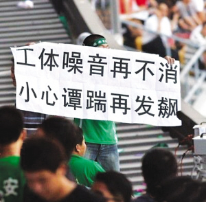 昨晚7點(diǎn)30分,2009賽季中超第14輪比賽全面打響,北京國安隊(duì)主場(chǎng)迎戰(zhàn)大連實(shí)德隊(duì)。盡管昨天并不是周末,但北京工人體育場(chǎng)上座率依然很高,球迷們打出了各種個(gè)性十足的標(biāo)語,如“工體噪音再不消 小心譚踹再發(fā)飆”,還有球迷身著“國安,跟丫死磕”的T恤衫到場(chǎng)為北京國安隊(duì)加油助威。另外,大連藍(lán)色激浪球迷也組織了聲勢(shì)浩大的助威團(tuán),專程從大連趕到北京為自己的球隊(duì)加油助威。