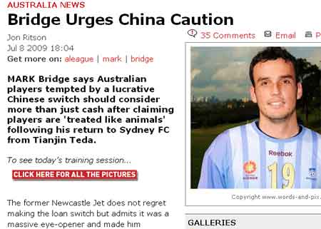 中新網(wǎng)7月9日電 布里奇,一個(gè)天津泰達(dá)隊(duì)球迷都不會(huì)陌生的名字。這位澳大利亞外援曾在本賽季初效力于天津泰達(dá)隊(duì),現(xiàn)在已經(jīng)離開中超加盟悉尼FC隊(duì)。日前他在接受澳大利亞《442》雜志采訪時(shí)憤怒的回憶了在中超的悲慘生活。他表示,中超的球員就像畜生一樣被對(duì)待。