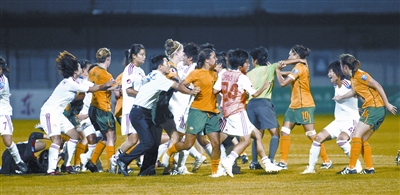 1:2落后,澳大利亞姑娘們似乎眼睛都紅了!兇猛得近乎男足的飛鏟在最后的時刻頻頻上演,無論是中國隊還是澳大利亞隊都在咬著牙堅持著。傷停補時的到來使得這場較量進入白熱化,門將張越的一次受傷倒地成為導火索,澳大利亞隊認為中國隊是在故意拖延時間,兩隊頓起糾紛,雙方替補席上的非比賽人員均沖入場內,一陣混亂過后,一名中國隊教練和澳大利亞隊后衛(wèi)都被出示黃牌,如此激烈的判罰引起了澳大利亞球員的普遍不滿……