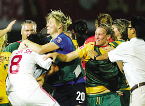 比賽結(jié)束后,按照慣例,雙方球員需要在中圈相互握手。可是一位澳大利亞小個(gè)子球員卻趁機(jī)沖到張?jiān)矫媲,一記“老拳”砸向了她的肋骨。后者被打中后立刻倒地不起,并且因(yàn)樘弁措y忍而流淚。這也成為此后騷亂的導(dǎo)火索,看到隊(duì)友被打,中國(guó)隊(duì)的場(chǎng)上球員和場(chǎng)下球員都沖向了這名小個(gè)子球員欲討說(shuō)法,而中方教練也沖到了場(chǎng)內(nèi)。此時(shí)澳大利亞隊(duì)的球員和教練也沖向場(chǎng)內(nèi),一時(shí)間場(chǎng)面十分混亂。雙方不僅互相推搡,更有許多肢體上的接觸。亞足聯(lián)官員看到這一情形后,也快速走向場(chǎng)內(nèi)。經(jīng)過(guò)了長(zhǎng)達(dá)十分鐘的調(diào)解,事態(tài)才逐漸平息。