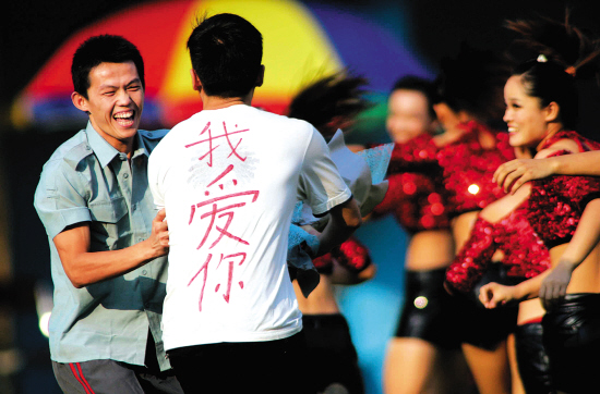 “我愛你……!”昨天下午,廣州越秀山體育場(chǎng)正在舉行中超足球賽,中場(chǎng)休息時(shí),一群紅衣足球?qū)氊惖菆?chǎng)激情表演,突然,一名身著“我愛你”衣服的男子,手持鮮花沖進(jìn)球場(chǎng),寶貝們當(dāng)場(chǎng)“四處逃散”。隨后該男子被保安拖出場(chǎng)……頓時(shí)四周響起一片喧囂聲。 本報(bào)記者 鄭迅 攝影報(bào)道