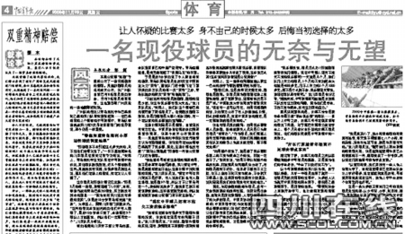 今年9月2日進(jìn)行的中甲聯(lián)賽中,四川隊(duì)坐鎮(zhèn)主場四川大學(xué)體育場對(duì)陣青島海利豐,客場作戰(zhàn)的海利豐3球領(lǐng)先,但該隊(duì)隊(duì)員卻在最后時(shí)刻連續(xù)三次吊射本方球門,不得不讓人懷疑有人在操控比賽。中青報(bào)這篇《一名現(xiàn)役球員的無奈與無望》的報(bào)道就從這場比賽切入正題,報(bào)道中稱,一名不愿意透露姓名的川足隊(duì)員說,“我也想盡早知道這場球的調(diào)查結(jié)果,我不是希望青島被罰降級(jí)或四川留在中甲,我是真想知道能不能從這場比賽中找到假球的證據(jù)。”