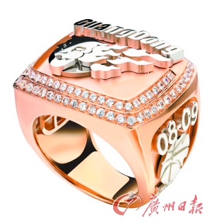 據(jù)鉆戒設(shè)計人員透露,為使設(shè)計更加新穎,在材質(zhì)的挑選上采用了正逐漸成為全球珠寶市場主流的18K玫瑰金,每枚重達40克,頂部鐫刻著廣東隊的隊標,環(huán)繞以79粒晶瑩的高品質(zhì)鉆石;戒指的右側(cè)面鐫刻著“08-09”的字樣和CBA籃球面孔的標志,左側(cè)是球員姓名及球衣號碼;指環(huán)下方用鐳射技術(shù)刻有“戴夢得”的字樣。整個戒指通體造型渾厚穩(wěn)重,溢彩流光,充分表現(xiàn)出冠軍球隊的王者之氣。戒指上的信息全部采用工藝復(fù)雜的分件倒模技術(shù),呈現(xiàn)凸字效果,增加戒指立體感及時尚感。