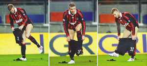 不知是不是太過(guò)賣(mài)力,動(dòng)作幅度太大,貝克漢姆的球褲在比賽中竟然撕裂了。向裁判申請(qǐng)后,米蘭隊(duì)工作人員將新球褲遞了上來(lái),場(chǎng)上的萬(wàn)人迷直接站在草地上,一把扯下身上的球褲,扔在地上,再將新球褲穿了上去。整個(gè)動(dòng)作連貫流暢,沒(méi)有一絲猶豫,不過(guò)在他彎腰的時(shí)候,全場(chǎng)觀眾仍然看到了他的黑色緊身內(nèi)褲下屁股的線(xiàn)條,這遠(yuǎn)遠(yuǎn)比貝克漢姆的腳法更容易讓女球迷激動(dòng)。