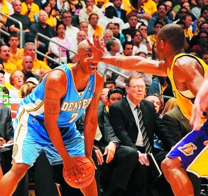 正宗的遮臉神功:巴蒂爾的手蓋在科比的臉上。