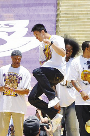 在杰克遜登臺之后,現(xiàn)場主持人開始依次介紹湖人球員,而第一個被介紹的,就是湖人唯一的新秀,中國球員孫悅。在聽到自己的名字被點到時,孫悅顯得十分興奮,走到了舞臺的中央,并高高躍起在空中轉(zhuǎn)了一個圈,讓一些正在觀看的記者驚呼見到了“中國功夫”。