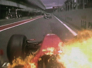 科瓦萊寧在進(jìn)站對(duì)賽車進(jìn)行修整后在加油管并未拔出的情況下便急匆匆駛離位置,硬生生將輸油管扯斷,導(dǎo)致燃油灑落在后面法拉利車隊(duì)的萊科寧車上,由于車體溫度很高,F(xiàn)60頓時(shí)起火,好在冰人立即擺頭將賽車駛離正路才避免更嚴(yán)重的事故發(fā)生,而科瓦萊寧在布朗GP車隊(duì)工作人員的幫助下才卸掉了被扯斷的輸油管。萊科寧回憶那驚險(xiǎn)的一幕時(shí)說(shuō),MP4-24的美孚燃油進(jìn)入了他的眼睛。