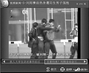 當(dāng)劉翔脫下白色外套換上釘鞋,準(zhǔn)備開始練跨欄時,一個穿黑色上衣,背著運(yùn)動包的陌生男子,從劉翔身后一下子把他抱住,臉上還露出了莫名的微笑,一副幸福的表情。這個怪異得近乎詭異的舉動一下子把劉翔給惹火了,此前還一臉放松的飛人,一下子板起面孔,雙手用力一揮把男子推開,向前走了兩步之后嘴里還忍不住嘟囔了幾句。