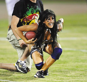 2009年,美國女子內(nèi)衣橄欖球大聯(lián)盟(簡稱LFL)正式誕生,聯(lián)盟由10支球隊組成,球隊選拔隊員時不求最壯只求最靚,球員是清一色的性感美女。一群身材火爆的辣妹,穿著讓人“流鼻血”的性感內(nèi)衣在場上肉搏美式足球,讓人大飽眼福的運動今年9月4日開打,頂著金融危機的風險,這項停辦兩年的比賽終于得以再度舉行。