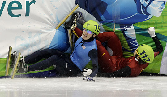 在王濛所在小組比賽行至倒數(shù)第二圈時,美國選手試圖超越王濛。此時包括王濛在內(nèi)的前三位選手均被帶倒,王濛摔出賽道。比賽結(jié)束后,裁判判王濛犯規(guī),無緣決賽。