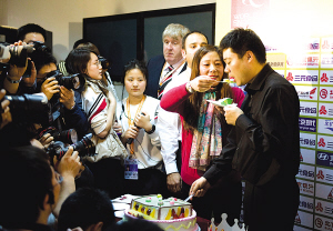 贏得了比賽,走進(jìn)新聞中心的丁俊暉非常開心,“今天比賽很精彩,打得還可以,上來就比較集中精力,今天比較動(dòng)腦子,一個(gè)機(jī)會(huì)得分,還能贏下比賽!边@時(shí)的丁俊暉完全不知道還有一個(gè)意外的驚喜在等著他。在簡(jiǎn)單回答了記者的幾個(gè)問題之后,賽事組委會(huì)的工作人員推上了一個(gè)臺(tái)球桌形狀的生日蛋糕,F(xiàn)場(chǎng)所有的記者和工作人員共同為丁俊暉唱響了生日歌,整個(gè)新聞中心變成了一個(gè)生日party!在所有人的祝福聲中,丁俊暉吹滅了生日蠟燭、切了蛋糕。