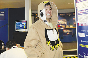 與比賽時西裝革履相比,昨天的丁俊暉更加多了一分童真。簡單的牛仔褲,運動鞋,外加一件黃色熊貓頭外套,讓23歲的小暉看起來活力十足。面對記者,丁俊暉還被朋友們打趣把衣服拉索拉到了頭,蒙著頭的小暉被裹在衣服里面,掙扎的動作引來一片笑聲。