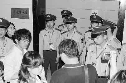 郭晶晶是否真的去找吳敏霞了?這個(gè)記者并不清楚,不過據(jù)記者了解吳敏霞不出席新聞發(fā)布會(huì)是因?yàn)楹ε卤弧罢`傷”。在郭晶晶第一次離開新聞發(fā)布會(huì)現(xiàn)場(chǎng)時(shí),記者也跟了出去。吳敏霞當(dāng)時(shí)剛剛接受完央視的采訪正準(zhǔn)備走進(jìn)更衣室,但此時(shí)竟然有一位簽名的男FANS跟著吳敏霞走進(jìn)了更衣室,不過好在現(xiàn)場(chǎng)武警反應(yīng)迅速,將他“揪了”出來。見現(xiàn)場(chǎng)形勢(shì)已經(jīng)非常混亂,武警索性集體站在了女更衣室的門口,一位現(xiàn)場(chǎng)工作人員邊打著電話,邊嚷著“守好,誰都不讓進(jìn)去”。