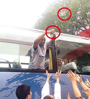 5月23日晚上,湖南湘西某地有關(guān)方面邀請(qǐng)美國(guó)體育使者男子明星籃球隊(duì)與立陶宛蘇托瓦職業(yè)男子籃球隊(duì)在該地體育館舉行對(duì)抗賽。賽前,兩支球隊(duì)分別到當(dāng)?shù)氐囊恍┲袑W(xué)進(jìn)行訪問(wèn),然而,在5月22日美國(guó)體育使者男子明星籃球隊(duì)到市第一中學(xué)訪問(wèn)時(shí)出現(xiàn)讓人憤怒的一幕,一美國(guó)球員在車輛離開校園時(shí)打開窗戶,向圍觀的中學(xué)生撒人民幣,造成現(xiàn)場(chǎng)一度失控。
