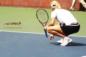 昨天中午,正當(dāng)眾多大腕在訓(xùn)練場進(jìn)行最后練習(xí)的時(shí)候,一只松鼠突然闖入訓(xùn)練場。突然面對這么多人、還有這么多來回移動(dòng)的網(wǎng)球,受到驚嚇的小松鼠有些不知所措。在場地周圍來回奔跑,甚至橫穿了德娃正在訓(xùn)練的球場。中途,它還遇到一只網(wǎng)球擋路,它還不得不跟網(wǎng)球“搏斗”了一番,引得場外球迷的一片驚訝聲。