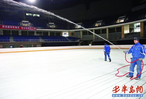 預(yù)計(jì)兩天時(shí)間,專家就可為1800平方米的賽場鋪上一層大約4厘米厚的冰面,為4月份將要在青島舉行的十一運(yùn)花樣滑冰和短道速滑的比賽做好準(zhǔn)備。