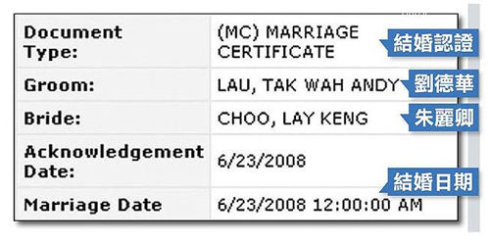 華仔的婚事一向很隱秘,但也敵不過高超的狗仔隊(duì)。近日,狗仔隊(duì)飛往美國拉斯維加斯調(diào)查,曝光了劉德華與朱麗倩的結(jié)婚證。原來,劉德華與朱麗倩早在2008年6月23日就結(jié)婚了,兩人分別以粵語發(fā)音的英文名字Lau Tak Wah Andy(劉德華)和Choo Lay Keng(朱麗卿,朱麗倩的本名)登記。(何佳穗)