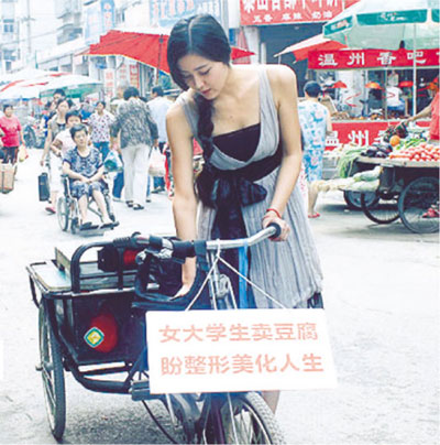 小雅推著輛人力三輪車(chē),上面鋪上木板擺上豆腐,車(chē)前還掛有一塊牌,寫(xiě)著“女大學(xué)生賣(mài)豆腐,盼整形美化人生”。