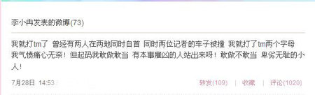 最近福建兩位記者因揭露“紫金礦業(yè)”,結(jié)果在同一天兩位記者的車子同時(shí)被撞。李小冉尤其關(guān)注這則新聞,她在昨日中午的微博中發(fā)飆:“天災(zāi)就夠叫人無奈的了,人禍也是沒完沒了!彼 在微博中爆粗口,引來粉絲圍觀,認(rèn)為其有損形象。