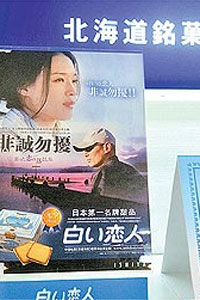 舒淇主演的《非誠勿擾》去年在中國創(chuàng)下驚人票房,帶動取景地日本北海道觀光人潮,旅游業(yè)者趁勢推出電影套裝行程,當(dāng)?shù)孛a(chǎn)“白色戀人”餅干更把海報當(dāng)免費宣傳,在當(dāng)?shù)仉S處可見,連名古屋機(jī)場也看得到,可說是揚威日本。