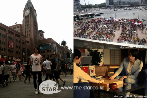 當(dāng)天金希澈登出3張照片,分別是站在北京街頭拍攝的本人瀟灑照,排成HEE字樣的中國粉絲們的照片,和一張貌似畫報(bào)的照片。