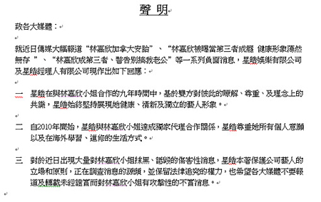 就在新聞鬧的沸沸揚(yáng)揚(yáng)的同時(shí),林嘉欣所屬的香港經(jīng)紀(jì)公司星皓昨天發(fā)表聲明,提到“公司和林嘉欣合作9年,堅(jiān)持展現(xiàn)她健康、清新及獨(dú)立的藝人形象。2010年彼此達(dá)成獨(dú)家代理合作關(guān)系。”更強(qiáng)調(diào)“近日出現(xiàn)對(duì)林嘉欣抹黑、詆毀的傷害性消息,正在調(diào)查消息的源頭,并保留法律追究的權(quán)力!
