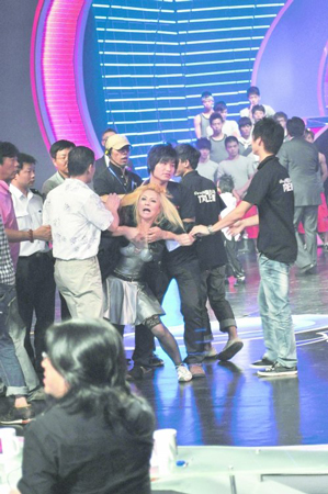 湖南衛(wèi)視的《快樂男聲》剛剛落下帷幕,東方衛(wèi)視的《中國達人秀》即將迎來高潮。不過,在前日舉行的《中國達人秀》首場半決賽中卻發(fā)生了意外狀況,被淘汰的選手陳靜大鬧現(xiàn)場,最終周立波動用了自己的保鏢才將她和她的丈夫請出舞臺。而一旁的評委高曉松說了一句“上海男人慫”,也惹得眾多網(wǎng)友不滿。昨日,這段從節(jié)目中刪除的視頻流傳到了網(wǎng)上,成為網(wǎng)友熱議的焦點。對于選手的偏激行為,昨日《中國達人秀》的宣傳總監(jiān)陸偉解釋說:“陳靜未能晉級的失望心情我們可以理解,但她在現(xiàn)場選擇這樣的方式來發(fā)泄,顯得有些過激,因此在節(jié)目最后公開播出的版本中,刪去了這段實況。”