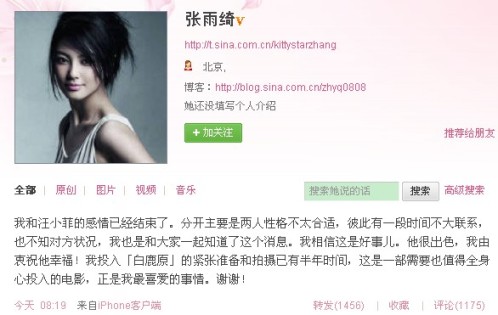 張雨綺在微博中表示:“我和汪小菲的感情已經(jīng)結(jié)束了。分開主要是兩人性格不太合適,彼此有一段時間不大聯(lián)系,也不知對方狀況,我也是和大家一起知道了這個消息。我相信這是好事兒。他很出色,我由衷祝他幸福!我投入《白鹿原》的緊張準備和拍攝已有半年時間,這是一部需要也值得全身心投入的電影,正是我最喜愛的事情。謝謝!”