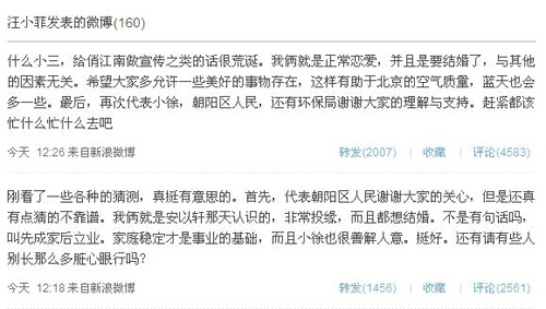 此后汪又再次追發(fā)微博,表示“什么小三,給飯店做宣傳之類的話很荒誕。我倆就是正常戀愛,并且是要結(jié)婚了,與其他的因素?zé)o關(guān)。希望大家多允許一些美好的事物存在,這樣有助于北京的空氣質(zhì)量,藍(lán)天也會多一些。最后,再次代表小徐,朝陽區(qū)人民,還有環(huán)保局謝謝大家的理解與支持。趕緊都該忙什么忙什么去吧!
