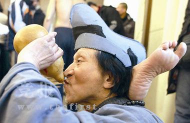 在演員較為集中的一個大會議室中,一個赤膊的青年男子在往身上涂金黃色的顏料,化妝師在給姑娘們卷頭發(fā)。角落的地面上,“濟公”旁若無人,一手拿著扇子,一手拿著葫蘆,腳后跟枕在腦后,似乎在練“柔術(shù)”。