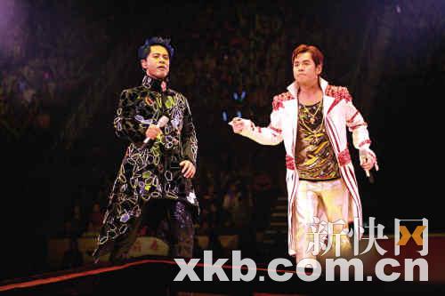 據(jù)香港媒體報道,譚詠麟、李克勤一連12場的“2009東亞運動會左麟右李演唱會”2月1日晚在香港紅館揭開序幕,成為紅館裝修重開后頭炮演唱會的歌手,吸引了不少嘉賓捧場,除阿倫母親、克勤與太太盧淑儀的父母外,還有霍震霆、民政事務(wù)局局長曾德成等。瘦身成功的“左麟右李”分別大秀健碩手臂及胸肌,令歌迷尖叫。阿倫更拿出金色斜袋邊唱邊狂收紅包,高興得連歌都忘了唱,相當(dāng)搞笑。