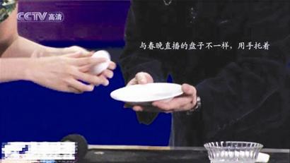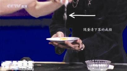 圖七,好了,這一動作做完后,劉謙用左手接過董卿的戒指把玩一番,并問董卿這枚戒指有多貴,這一過程,劉謙很自然地把戒指放到了右手,注意,是塞到了右手的食指和拇指中間,因為右手的食指和拇指中間已經(jīng)捏著個被皮筋拉扯的掛鉤,塞進戒指后他用左手扭動著戒指,好像在做下意識的動作,其實,是把戒指環(huán)掛到那個掛鉤上,這一動作是在右手的食指和拇指“捏合”之中完成的,觀眾是看不到的,由于角度的原因,觀眾也看不到那根細(xì)細(xì)的皮筋。