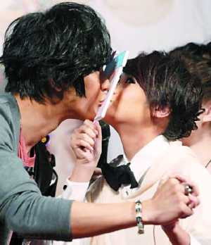 至于偶像劇《愛就宅一起》前日也在臺北舉行首映會,還是單身的楊丞琳和汪東城就在現(xiàn)場玩起了“安全之吻”。應(yīng)主持人要求,親吻長度將是收視率數(shù)字,兩人為了有好采頭,硬是吻了15秒,讓臺下觀眾拍掌叫好。