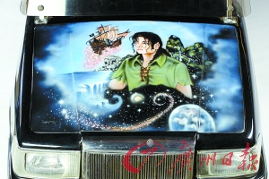 拍賣物品中引人注目的還有輛黑色電動敞篷小汽車,像是件兒童玩具。車身上描繪著童話里永遠長不大的孩子王彼得·潘的形象。在車頭引擎蓋上,邁克爾·杰克遜還把自己幻化為彼得·潘的形象,被星光、海盜船和何有鄉(xiāng)的夢幻世界環(huán)繞著。