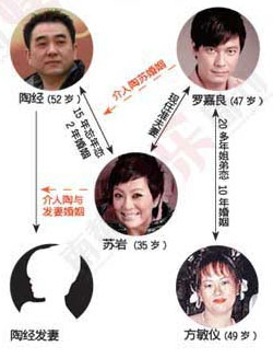 蘇巖和羅嘉良的結(jié)婚,用那個(gè)落后保守的詞來(lái)說(shuō),是兩個(gè)第三者的婚姻。蘇巖曾是中國(guó)電影第一錄音師陶經(jīng)的妻子,愛(ài)情源頭還是張藝謀的《活著》。蘇巖甘當(dāng)陶經(jīng)婚姻第三者,歷經(jīng)十多年終于結(jié)婚,而羅嘉良這次又介入了蘇巖的上一次婚姻。一直有猜測(cè)說(shuō)蘇巖是導(dǎo)致羅嘉良與發(fā)妻離婚的第三者,其實(shí)不是,反倒是羅嘉良讓蘇巖下決心離婚的,F(xiàn)在兩人還在北京買了豪宅,羅嘉良正式落戶內(nèi)地了。