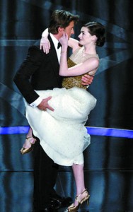 每一次頒獎(jiǎng)嘉賓上臺(tái)前,一身正裝的杰克曼都會(huì)用一小段串聯(lián)詞引出頒獎(jiǎng)嘉賓,當(dāng)娜塔莉·波特曼和本·斯蒂勒上臺(tái)頒最佳攝影獎(jiǎng)時(shí),全場觀眾驚呆。大變臉的斯蒂勒戴著大胡子和墨鏡,完全看不出真面目。上臺(tái)后,波特曼忙著在一旁致詞,但斯蒂勒卻東張西望,自顧自地嚼著口香糖。波特曼終于忍無可忍了,“你竟然在嚼口香糖,快吐出來。 ”斯蒂勒故做緊張狀,把口香糖黏在桌上。隨后仍東張西望,注意力完全不在臺(tái)上,“輪到你發(fā)言了。 ”波特曼提醒道,沒想到斯蒂勒竟然拿 《貧民富翁》開涮,“我聽說《貧民富翁》是用手機(jī)拍攝的一部電影。 ”說罷,斯蒂勒竟拿出一部手機(jī)擺弄起來,待到波特曼介紹提名影片時(shí),斯蒂勒又開始在舞臺(tái)上四處游走。
