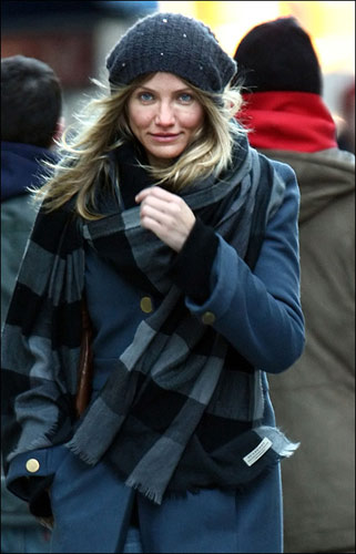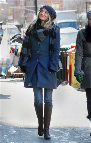 卡梅隆·迪亞茨這位高挑美女,這次頭帶藍色大號毛線帽子,身穿藍色呢子大衣,就像是一個可愛性感的大娃娃。但是好像臉上的皺紋稍微多了點,看來卡梅隆·迪亞茨要好好保養(yǎng)自己的臉蛋了。