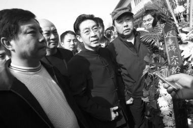 上午10點告別儀式開始,人們排成長隊井然有序地進入靈堂。閆懷禮的遺體安臥在花叢中,面容安詳!吧窕觌x去芳名百世著清風(fēng),音容宛在勤奮一生傳佳話”的挽聯(lián)十分醒目。靈柩旁,六小齡童、遲重瑞、馬德華等《西游記》主創(chuàng)垂淚站立。當(dāng)《西游記》主題曲《敢問路在何方》在靈堂響起,眾人嗚咽聲一片。