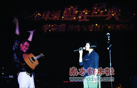 張艾嘉的出現(xiàn)令觀眾極為興奮。這個(gè)被李宗盛稱(chēng)為“大姐”的女人一上臺(tái)就調(diào)侃李宗盛:“在歌壇里,小李是我的最?lèi)?ài),那你的最?lèi)?ài)是誰(shuí)?”讓李宗盛無(wú)言以對(duì)。她唱起了《我這樣愛(ài)你到底對(duì)不對(duì)》、《因?yàn)榧拍,還不忘輕松地在舞臺(tái)上表現(xiàn)兩個(gè)人的友情:“你們看過(guò)小李演的電影沒(méi)有?他演的多數(shù)是喜劇,悲劇也能演成喜劇,每次都演我的丈夫或者男朋友,唉,我真的很不幸……”此外她還逼問(wèn):“你的歌都很浪漫,不知道你是不是一個(gè)浪漫的男人?”李宗盛據(jù)實(shí)以答:“把渴望而不可得的寫(xiě)入歌中,我的實(shí)際人生很沉悶的。”張艾嘉最后很奔放地勸說(shuō)他:“再找個(gè)好點(diǎn)的,再生個(gè)妞。”記者 齊帥 攝影 馬強(qiáng)