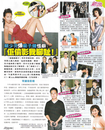 今年39歲的蔡子健,進(jìn)入演藝圈之前曾當(dāng)過救生員、福利工作者、平面設(shè)計(jì)師、旅行團(tuán)領(lǐng)隊(duì)和保險(xiǎn)經(jīng)紀(jì)等,1993年加入無(wú)線藝員訓(xùn)練班,拍完情景劇《開心華之里》后不久便被調(diào)去主持《閃電傳真機(jī)》節(jié)目,之后拍過無(wú)數(shù)旅游特輯,故有“旅游王子”之稱。因經(jīng)常出差,他愛上攝影。據(jù)資料顯示,2001年,蔡子健與蔡少芬合拍《陀槍師姐3》時(shí),兩人演夫妻拍一場(chǎng)婚紗戲。當(dāng)時(shí)蔡少芬不經(jīng)意地大爆蔡子健的怪癖:“子健人不錯(cuò),很懂得照顧人,還整天幫我照相,有一次還偷拍我的腳趾!”據(jù)知,拍劇時(shí),蔡少芬經(jīng)常貪舒服穿著拖鞋到處走,其修長(zhǎng)的美腿和腳趾引起蔡子健的興趣,所以拍下來(lái)作收藏。近日,記者就此事詢問蔡少芬,但據(jù)悉無(wú)線已下令藝員“封口”,蔡少芬對(duì)關(guān)于蔡子健的問題立即裝聾扮啞,拒絕作答。