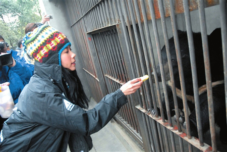 莫文蔚2004年3月成為亞洲動(dòng)物基金“拯救黑熊愛心大使”,隨后,只要她到成都,一定要抽出時(shí)間前往黑熊救護(hù)中心。這次來成都參與震后的公益慈善活動(dòng),莫文蔚昨日一大早就來到了救護(hù)中心。“寶貝兒”是2005年初莫文蔚認(rèn)養(yǎng)的一只取膽黑熊,經(jīng)過工作人員4年的精心照料,“寶貝”早已康復(fù)。當(dāng)莫文蔚來到“寶貝”的喂養(yǎng)間時(shí),“寶貝”似乎認(rèn)識(shí)恩人,一看到莫文蔚就活蹦亂跳。莫文蔚也開心不已,還把特意帶來的水果蘸上蜂蜜喂給“寶貝”(上圖)。昨日莫文蔚還看望了最新救助的12頭黑熊以及棕熊“凱撒”,一路上笑聲不斷。